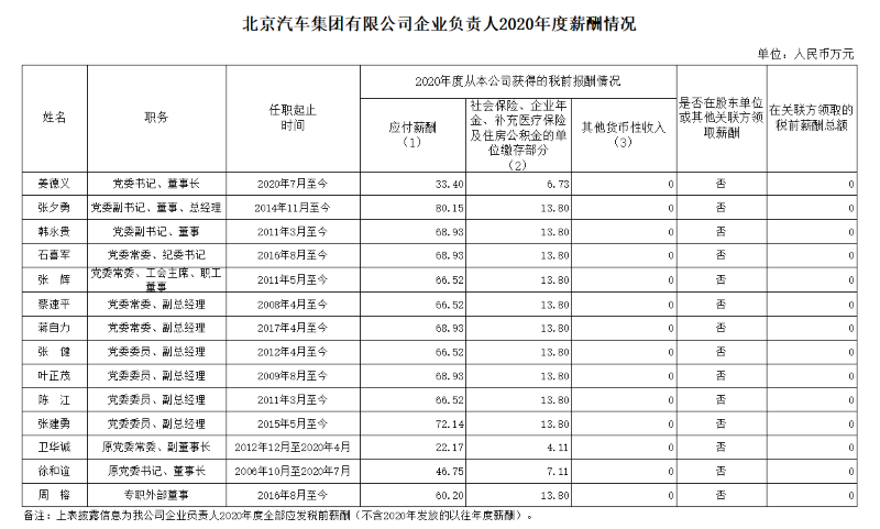 北京汽車集團(tuán)有限公司企業(yè)負(fù)責(zé)人2020年度薪酬情況