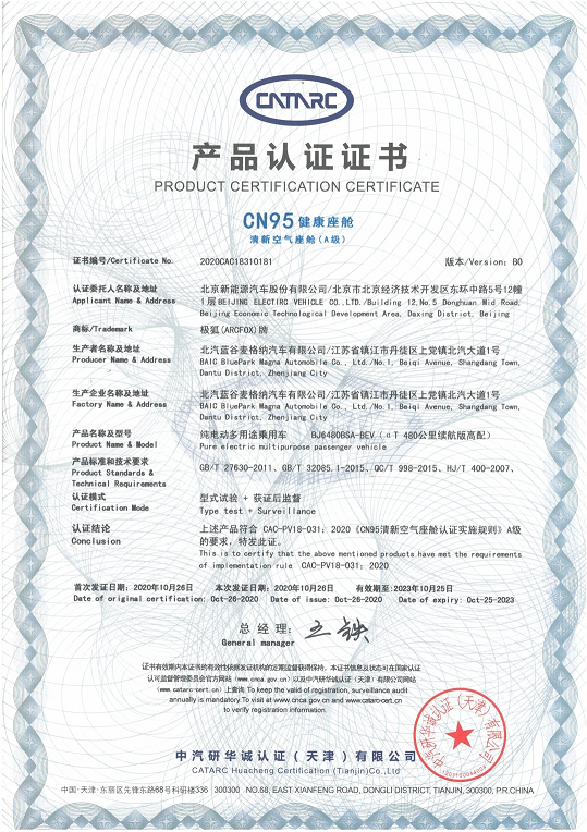 The CN95 healthy cabin certification is a certification system jointly launched by CATARC Huacheng Certification (Tianjin) Co., Ltd. and Chongqing Caeri Quality Testing and Certification Center Co., Ltd. on March 28, 2020, and is one of the first to be filed at the Certification and Accreditation Administration of China. The set of certification rules represents the first (and the only one at present) CN95 health certification system for auto products at home, evaluating the health and safety levels of auto products based on the certification mode that combines product type tests and post-certification supervision.