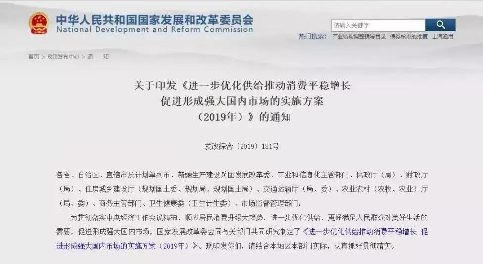 2019年1月29日,國家發改委等十部門印發《進一步優化供給推動消費平穩增長 促進形成強大國內市場的實施方案(2019年)》(以下簡稱《方案》)。方案制定六大措施促進汽車消費,涉及老舊汽車報廢更新、新能源補貼、農村汽車更新換代等方面。《方案》提到,2019年,發改委將促進農村汽車更新換代。有條件的地方,可對農村居民報廢三輪汽車,購買3.5噸及以下貨車或者1.6升及以下排量乘用車,給予適當補貼,帶動農村汽車消費。