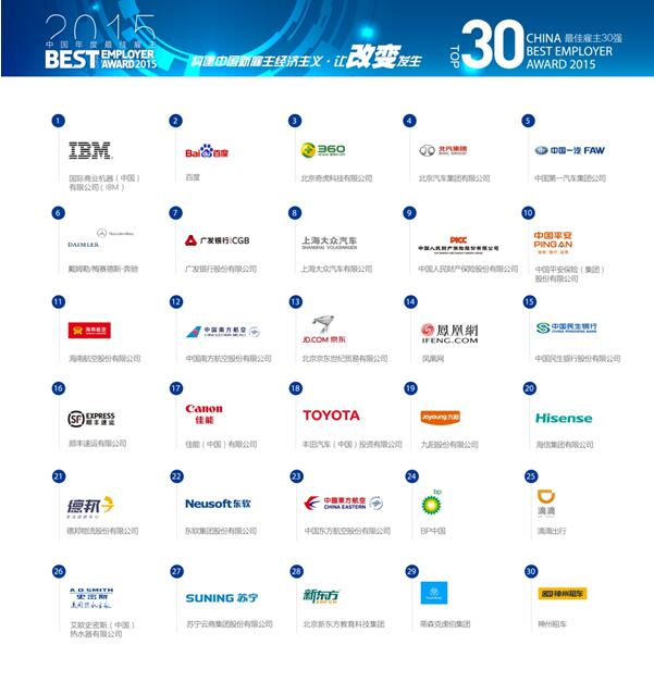 附:2015中國年度最佳雇主30強(qiáng)企業(yè)排名榜單