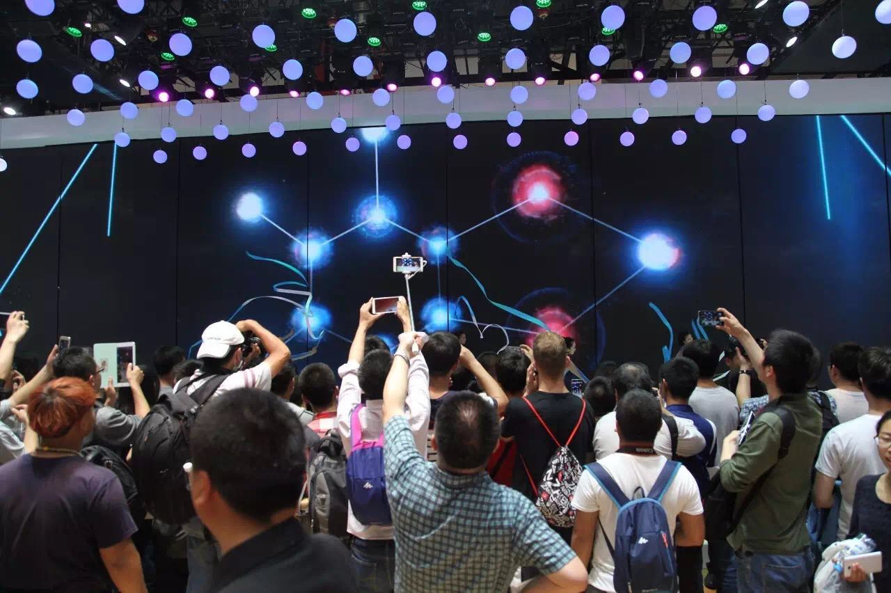 奪人眼目的是,展廳上方浮動著的彩色氣球燈。這些數(shù)以百計的小燈以電腦編程控制上下浮動,可謂是波瀾壯闊。此外主展臺的大屏,旋轉(zhuǎn)開合、精彩迭出。如此大范圍的組合應(yīng)用,在世界大型車展上并不多見。