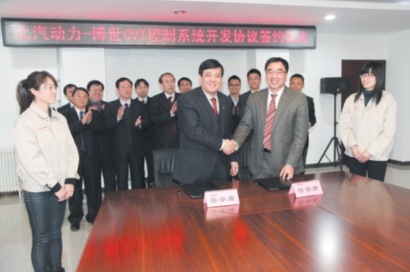 3月20日,北汽動力總成公司與德國博世工程公司就CVT控制系統開發項目進行洽談,北汽集團副總經理、動力總成公司總經理馬童立與德國博世(中國)副總裁徐大全在合作開發協議上簽字。
